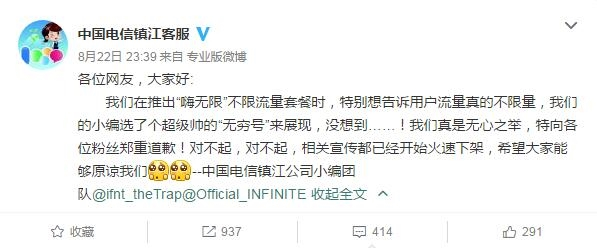 原来,中国电信镇江分公司要选择一个“无穷号”来展现自家的“不限流量套餐”,特意选了一个超级帅的符号。尴尬的是,这个符号正是INFINITE的Logo。
