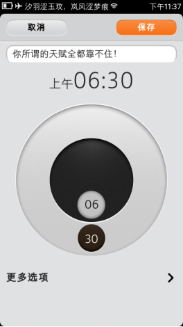 闹铃设置的方式也很新颖,关闭闹铃的方式类似于Lumia接电话的方式就不截图了。