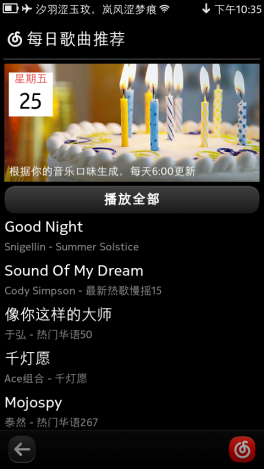 午睡之前习惯的听一会收音机或者纯音乐,N9内置的音乐播放器支持FLAC无损音乐,夜切大大制作的第三方网易云音乐可以通过微博账号登陆获取每日推荐的歌曲,不过评论的话只能看不能评论,,,可以搜索可以下载可以在线听,