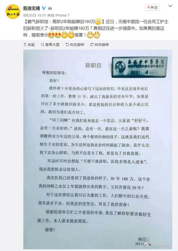 据报道,24日晚,一张图为无锡中医院某员工浦某某的辞职信火了。与晒情怀、示可怜的风格迥然不同,这封辞职信堪称"史上最霸气",称自己闲暇之余2年就能赚180万,何苦要花30年?