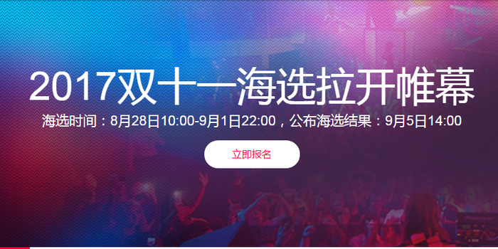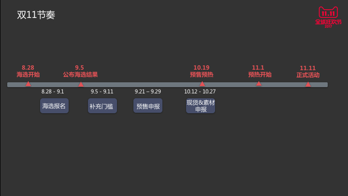 1、双11活动节奏(本次海选报名时间为:2017年8月28日10:00-9月1日21:59:59 千万别错过啦)