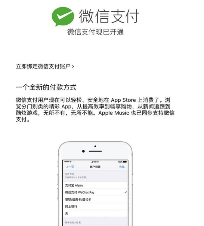 苹果官方声明称:“我们很高兴中国大陆的用户现可以使用微信支付购买他们喜欢的app或是订阅Apple Music。我们继续致力于在Apple生态内为顾客提供多种简单又方便的支付方式。”