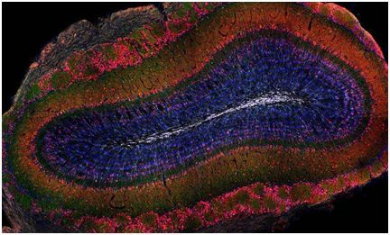 新的神经元(白色)进入嗅球,即大脑中加工气味信号的区域。图片来自University of Basel, Biozentrum。
