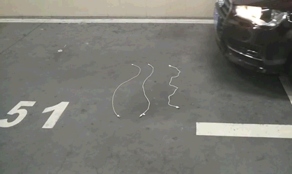 测试车辆为奥迪A3,用左前轮碾压三款数据线,值得注意的是使用尼龙编织外披的公牛Type-C编织数据线和华为原装数据线柔韧性非常好,而使用PVC外被的品胜线无法拉直,所以测试时总会弯曲着。