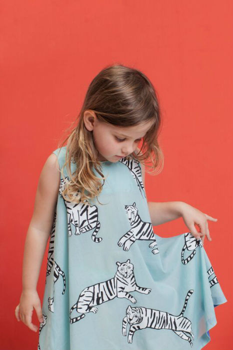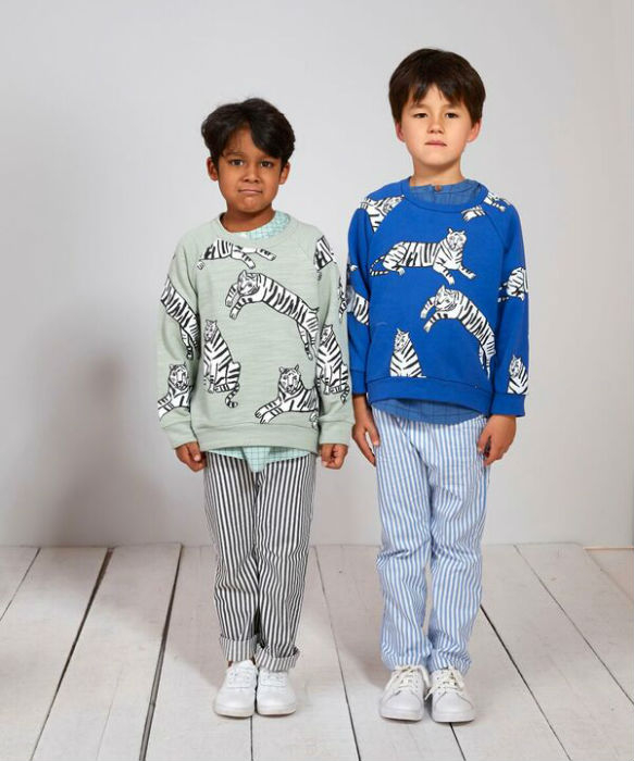 两个混血孩子在中国的成长,也给了Kate许多灵感。Kate觉得,孩子应该在一个更为自由开阔的环境里成长:“我们英国人总是说,杀不死你的东西会让你更强大,所以我们不在乎孩子把自己弄得脏一点,那能让他们的抵抗力变强。”而在设计中,Kate也希望能把这种更加敢于表达自我,更自信的方式通过服饰,赋予给每一个孩子。“虽然孩子们淘气的时候有时候会让大人觉得累,但正是这种淘气,才是孩子们探索世界的方式。”Kate常常会和插画师、艺术家合作,让他们用不同的方式,诠释这种理念。最近一期的主题“逃离,去马戏团!”就用了一位插画师的作品,无论是抽象的老虎,还是彩色条纹的小丑服,追溯的都是美妙的童年时光。