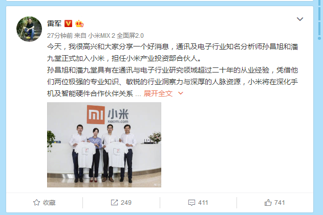 雷军发微博表示,“今天,我很高兴和大家分享一个好消息,通讯及电子行业知名分析师孙昌旭和潘九堂正式加入小米,担任小米产业投资部合伙人。“”