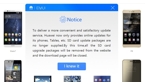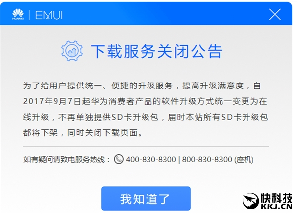 华为EMUI官方页面显示,“为了给用户提供统一、便捷的升级服务,提高升级满意度,自2017年9月7日起华为消费者产品的软件升级方式统一变为在线升级,不再单独提供SD卡升级包,并届时下架所有SD卡升级包,并关闭下载页面。”