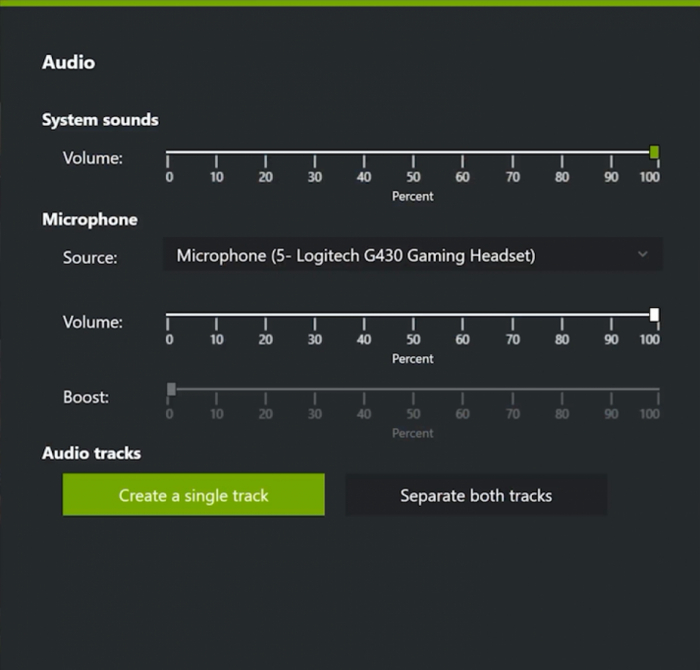 玩家可以在GeForce Experience界面中点击“麦克风”音频设置按钮,在Audio tracks(音频声道)选项中选择Separate both tracks(分离两条声道)即可开启该项功能。另外,玩家还可以根据设备情况设置系统声音和麦克风声音的大小,做出完美的解说视频。