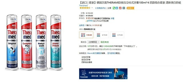 这款来自德国的汉高THERAMED按压立柱式牙膏在亚马逊4只套装售价89元。【产品详情】