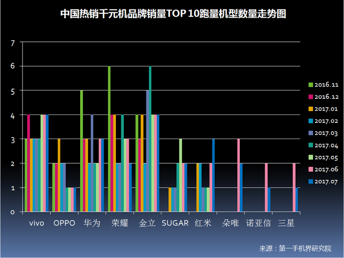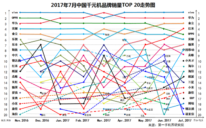 2017年7月中国热销千元机TOP 20中,vivo 4款、华为 3款、金立3款、红米3款、荣耀2款、OPPO、糖果、SOP、康佳、中国移动各1款。