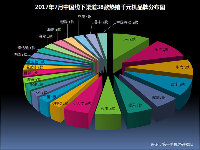 另外,2017年7月在中国大陆线下渠道走量的千元机机型一共有38款,基本分布是:vivo4款、金立4款、华为3款、红米3款、荣耀2款、糖果2款、朵唯2款、小天才2款、OPPO 1款、三星1款、小米1款、SOP 1款、康佳1款、酷派1款、诺亚信1款、欧亚信1款、博瑞1款、锋达通1款、海尔1款、海信1款、糖猫1款、亚奥1款、易丰1款、中国移动1款。