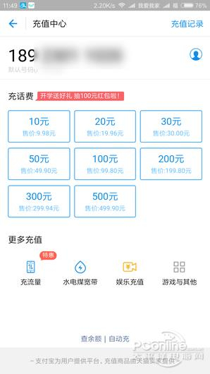 充值中心:手机充值、水费电费煤气费、固话、宽带、有线电视。还有各种的互联网娱乐平台充值服务。