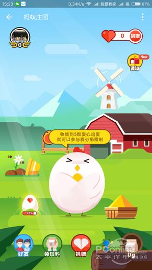 除了种树,支付宝还能养鸡,用户可以在蚂蚁庄园领养虚拟小鸡,之后需要获取饲料按时喂养,吃饱之后,鸡会下爱心蛋,而爱心蛋可用于捐赠公益项目。