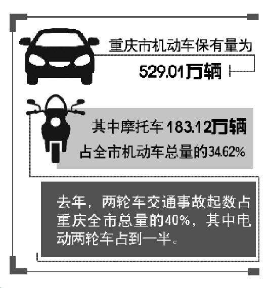 记者从重庆市交巡警总队了解到,截至今年4月20日,重庆市机动车保有量为529.01万辆,其中摩托车183.12万辆,占全市机动车总量的34.62%。去年,两轮车交通事故起数占重庆全市总量的40%,其中电动两轮车占到一半。