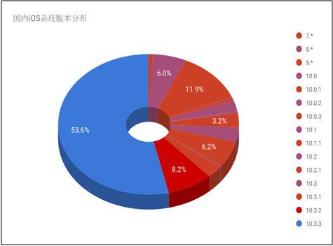 图1. 国内iOS设备系统版本分布(详细的系统版本比例分布图,从左半部分开始,逆时针方向按新旧版本次序依次为最新的iOS 10.3.3到4年前的版本iOS 7。)