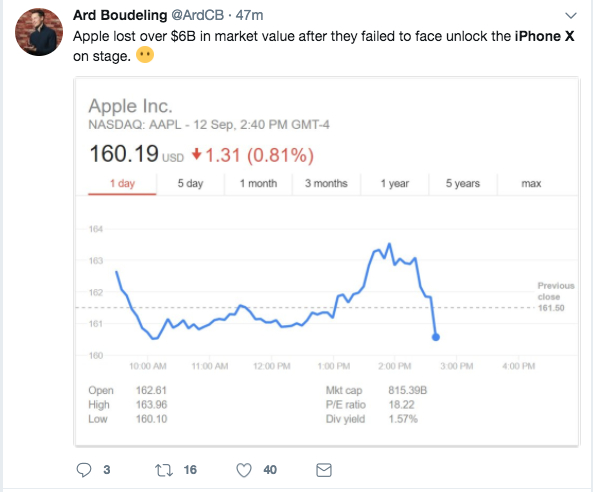 不过糟糕的是,看起来很高大上的人脸解锁,在发布会现场,主持人的第一次尝试却没有解锁成功。大写的尴尬!网友表示就解锁不开这一瞬家苹果股价下跌造成了60亿美金的损失。