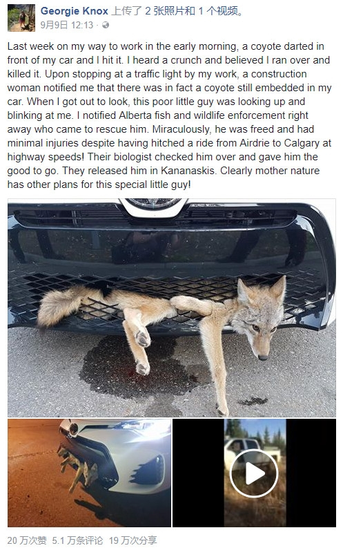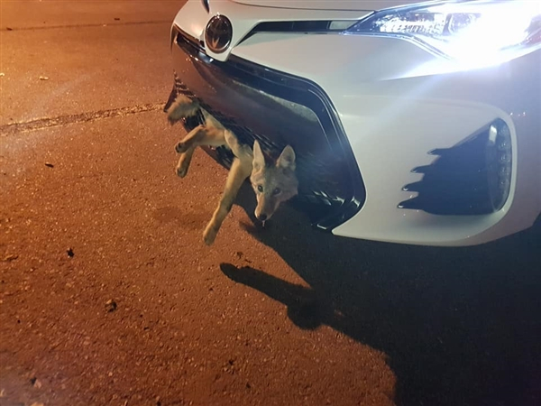 “上周一个早晨,我开车上班路上,一头郊狼突然出现在车辆正前方,然后我撞了它。我听到了压碎的声音,所以确信碾过并杀死了它。直到停到一个红绿灯路口,一位建筑女工提醒我,这头狼竟然嵌到保险杠里面。我赶紧下车查看,这个可怜的小家伙正在抬头注视着我。