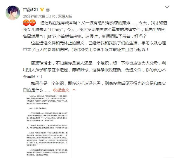 贾跃亭妻子甘薇也微博表示,“造谣现在是零成本吗?又一波有组织有预谋的轰炸……今天,我才知道我女儿原来叫“Tiffany”;今天,我才发现美国这么重要的法律文件,我先生的签名居然用“YT jia”这个简拼名来签。造假时,麻烦把脑子带着,好吗?”