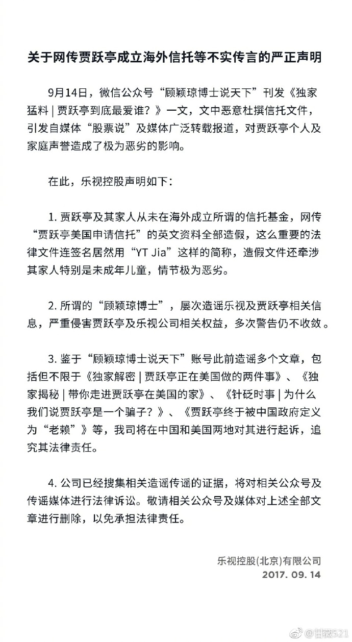 对此,乐视控股发声明表示,自媒体“顾颖琼”恶意杜撰信托文件,引发自媒体“股票说”及媒体广泛转载报道,对贾跃亭个人及家庭声誉造成了极为恶劣的影响,将进行法律诉讼。