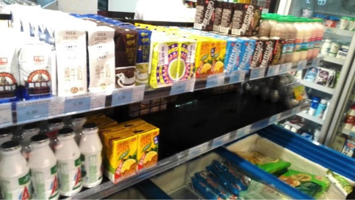 门口有块货架空的厉害,老赵看是维他奶、早餐奶什么的,就问黄店主这块是不是零售通下单补货了,黄店主表示,这个得他自己进,现在零售通货源还不怎么充足,还得和以前一样自己补,听说正在建仓,建起来就好了。