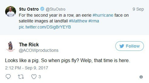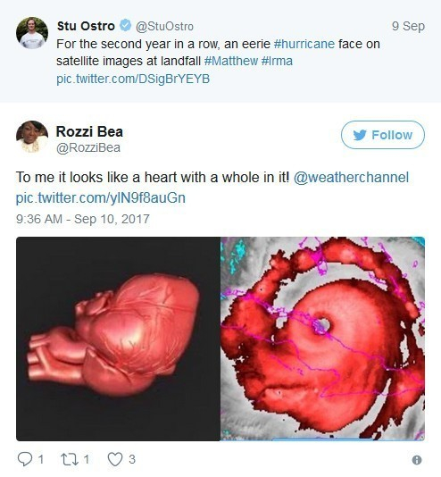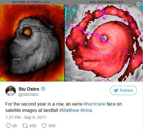 Ostro还将这张气象图跟2016年的马修飓风卫星图做了对比(左为马修飓风,右为艾尔玛飓风)。对此,有些人认为,艾尔玛飓风卫星图的恐怖程度不及马修,因为后者看起来更像是一张骷髅脸。