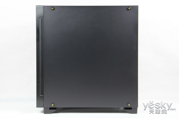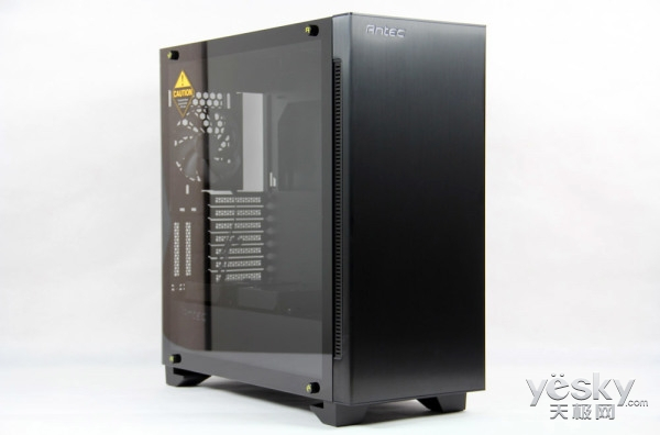 机箱左侧面是一整块全侧透的钢化玻璃盖板,常规四角铆钉固定,铆钉表面有醒目的安钛克logo,使侧面不显单调。钢化玻璃盖板右边,与正面板连接处设有一列机箱吸风孔,另一侧面对称相同,参考静音机箱最常用的侧吸风设计。