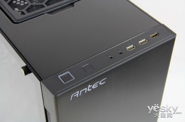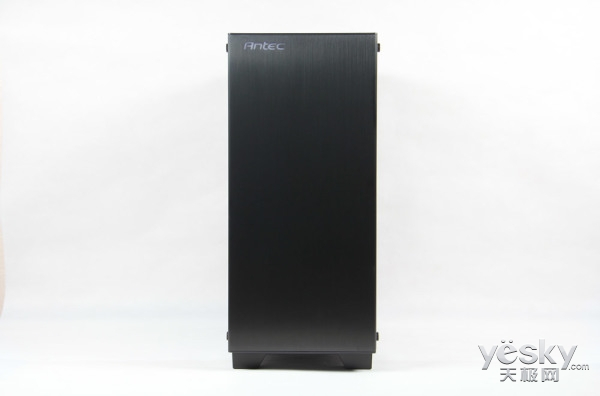Antec P110机箱正面板采用了金属铝材,并且使用了0.8mm厚的高弯折工艺处理,表面有拉丝工艺加持,通常仅出现于高端机箱中。除了左上角配有“Antec”发光标志外,其余部分没有多余修饰,是真正的简约又霸气。