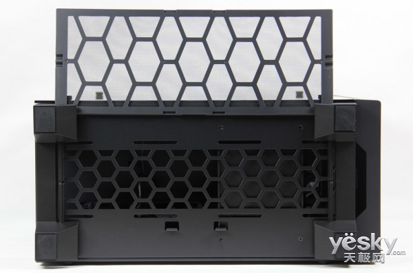 顶面其余部分主要是双风扇位通风孔搭配磁吸防尘网设计,通风孔位支持2个12cm或2个14cm散热风扇。磁吸防尘网也较为高端,并非普通的一整块软磁铁吸附,而是蜂巢网孔塑料架搭配吸力更强劲的点状磁钢吸附,配合顶部对应的凹槽,可使防尘网十分牢固的安置于顶面,如若不使点劲将其分离,绝不会有半点松动。