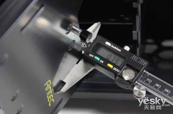 机箱的板材厚度也是DIY发烧友考虑的重要因素,本次安钛克P110机箱给出了厚达1mm钢板的官方参数,并且在前文的内部结构中,可以看见机箱内部侧板没有卷边设计,只需使用游标卡尺一测便知。