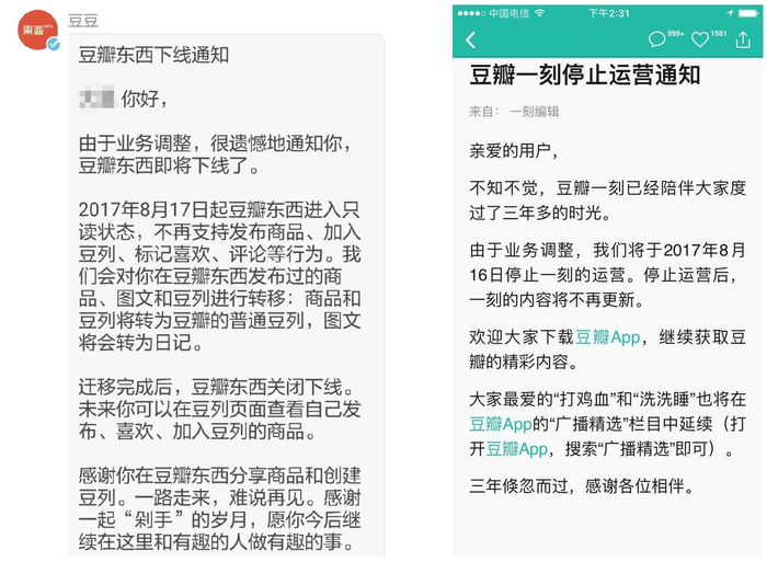 这一切的缘起,都是为了上市,日前,一封《豆瓣东西下线通知》如约抵达用户信箱,宣告豆瓣东西App在8月16日关停;随后,同样活了3年的豆瓣一刻App,也宣布在16日被终结。