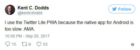 然而颇具讽刺的是,标准版Twitter的使用问题不单单只出现在发展中国家,即便来自本土的用户也抱怨原生软件的缺陷,于是他不得不使用Twitter Lite PWA(渐进式网页应用)。