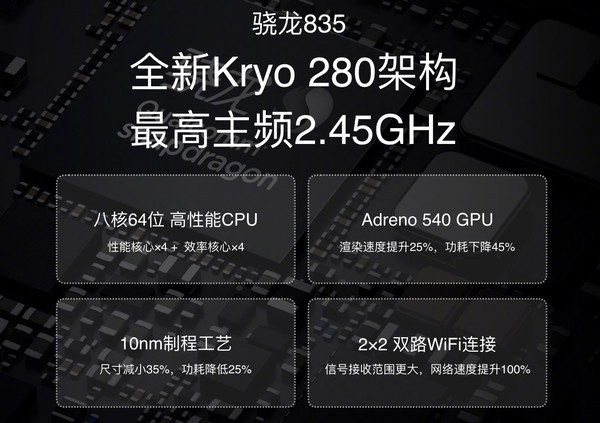 高通骁龙835采用的是半定制的八核Kryo架构,包括4×2.45GHz的性能丛集、4×1.9GHz的效率丛集。此外,高通骁龙835采用强劲的Adreno 540图形处理器,以及更先进的10nm制程工艺,无论功耗还是性能都有较大幅度的提升。