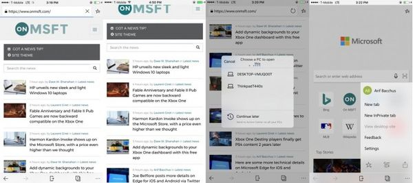 iOS端的Edge浏览器非常的简洁,有Windows 10以及Windows 10 Mobile的使用体验。在屏幕的地步会有五个图标,分别是前进和后退、Continue on PC (phone with arrow),所有标签页和设置图标。在页面滚动的时候这些所有图标都会隐藏,以便于将用户的注意力集中到屏幕上。