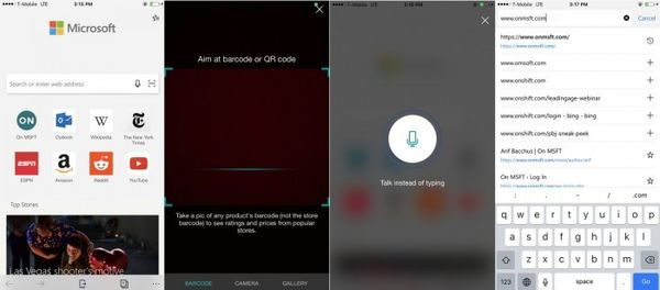 iOS端Edge浏览器的主屏幕和Windows 10端比较相似。在 微软 LOGO下方是搜索/地址栏,称之为“Top Sites”的常用网站。此外在地址栏上还有按钮能够扫描QR二维码,以及进行语音搜索。不过目前语言搜索功能尚未完善,无法使用。
