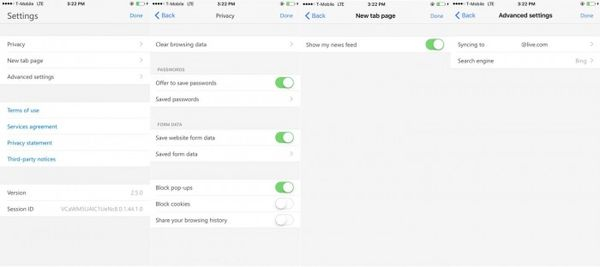 这里和Windows 10 Mobile版本基本上没有太大的差别,不过在“隐私”设置中包含了浏览数据、保存的密码和弹出阻止页面等等。用户还能在在设置页面选择关闭News Feed,更改默认搜索引擎至Google或者Yahoo等等。