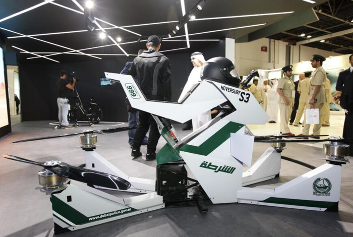日前,迪拜警方在迪拜电子展Gitex上展出了由俄罗斯无人机厂商Hoversurf制造的飞行摩托车。据了解,该摩托车可以携带一名警察,也可以远程操控。