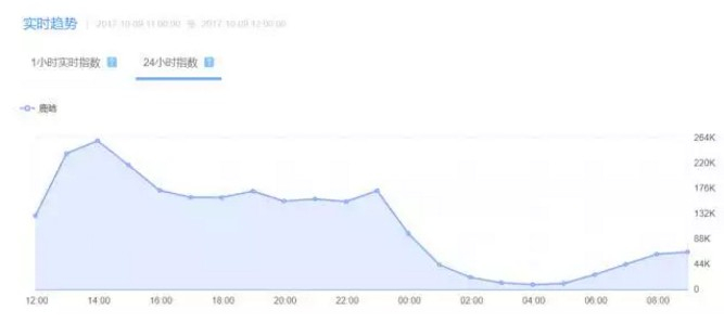 数据显示,宣布恋情后“鹿晗”在微博上的热度火速攀升,并在2小时后达到峰值。10月8日全天,“鹿晗”的微博指数超231万,约为“iPhone 8”的55倍。