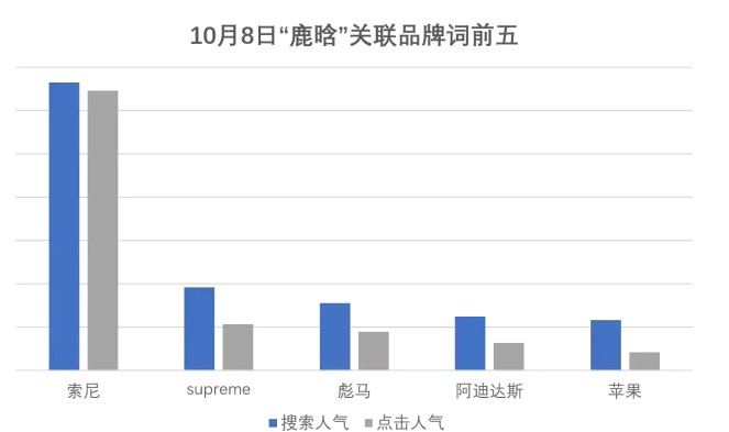 上图是10月7日、8日淘宝平台内关于“鹿晗”的搜索热词前十。从图中可以看到,在恋情宣布前各类“鹿晗同款”是搜索的主要关注点。