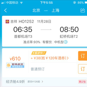 下午5点55分,记者先用A手机打开携程旅行APP,在上面随意选取了11月28日北京至上海的吉祥航空HO1252号航班的经济舱。吉祥航空携程旗舰店显示票价为610元,剩余票2张,显得票很紧俏。
