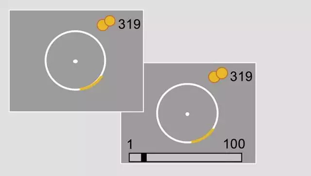 游戏截图。受试者需要先把水桶(黄色圆弧)放置在圆圈的某一个位置,随后在下方的滑块条上从1到100给自己的信心评分;评分完毕后,圆心会射出一枚硬币,被水桶接住就会得分。右上角显示当前累计积分。硬币射出的方向几乎总是和上一次差不多,这使被试有了判断依据。