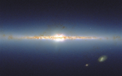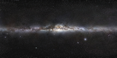 图为红外波段观测到的银河系,图片来自2MASS巡天项目。图片均为多次观测拼接而成。由于光学波段的星际消光,可以看到银河系在光学波段的成像是明暗相间的。