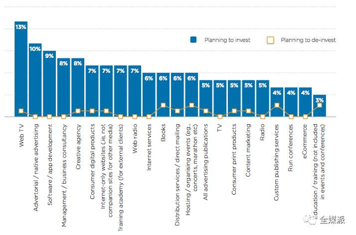 舍得砸钱,还要看准领域,在这个传媒业态飞速变化的转型期,往哪一处使劲才能求得更好的发展?10月初,全媒派精编世界报业和新闻出版协会发布的《2017全球新闻媒体展望报告》, 新闻编辑室下半场押注哪里?从一份大佬访谈录看出的端倪。报告显示,传媒大佬最有意愿投资的领域是:网络电视(视频)、原生广告及软件开发。