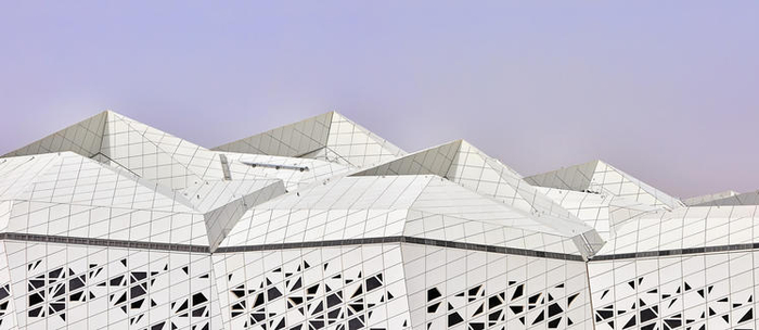 该中心位于沙特阿拉伯的利雅得高原上,占地近 70000 平方米,远远看上去,像是搁浅在沙漠中的数只白色游艇。