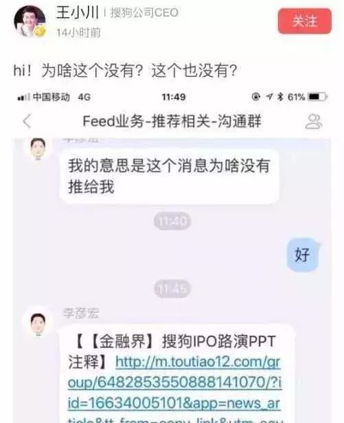 11月2日,有网友在脉脉上曝光了一张截图,这是百度内部一个Feed业务推荐相关沟通群。李彦宏在群里丢了一条新闻链接——搜狗IPO路演PPT注释。作为百度的竞争对手之一,李彦宏无疑对这则新闻很感兴趣。但他紧接着却是一堆黑人问号脸:这个消息为啥没有推送给我?这条新闻的链接却来自今日头条。