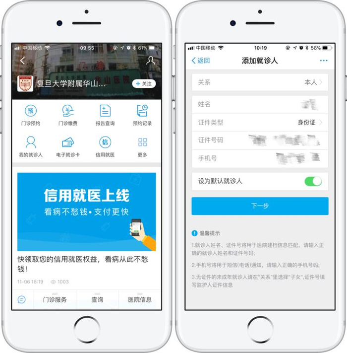 去医院前,患者可以用 “信用就医” 在手机上预约挂号付费、查看排号进度,到号时直接在医院的自助机取号而不再需要到窗口挂号。