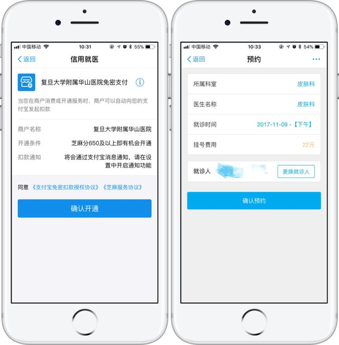 第一次使用支付宝需要填写姓名、身份证号、手机号来开通就诊卡,如果用户的芝麻信用分在 650 分以上、花呗额度在 500 元以上,就可以获得 1000 元的花呗额度来付医疗费。接着系统会提示用户开通支付宝免密服务,意思是以后在医院看病时,支付宝会自动从用户的账户余额、绑定的银行卡或花呗额度里扣款。