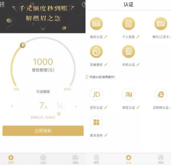 用户在APP中填写个人信息后,即可获得授信,信息包括身份证、银行卡、芝麻信用等,若填写京东、淘宝等资料,授信会进一步提升。