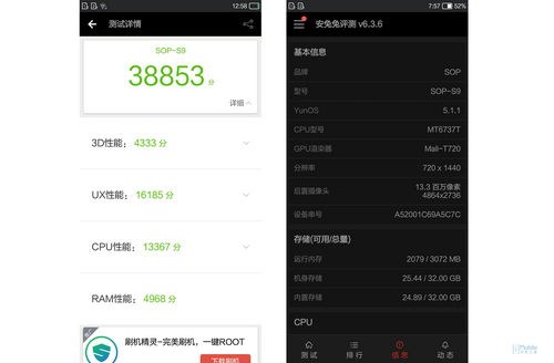 SOP S9在处理器方面采用的则是联发科MT6737T(标配版)/MT6750(高配版),内置3G RAM+32G ROM(标配版)/4G RAM+64G ROM(高配版)存储空间。安兔兔跑分接近4万,能够比较好的处理日常的应用。