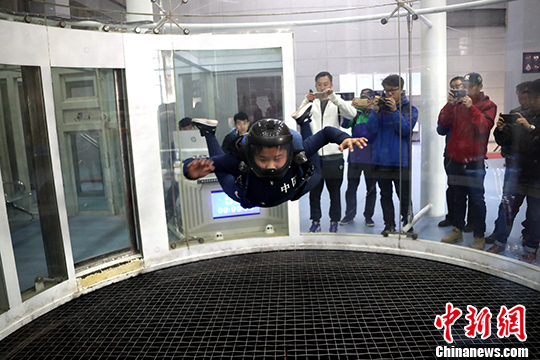 “舞动蓝天”梦想者在风洞内进行训练。