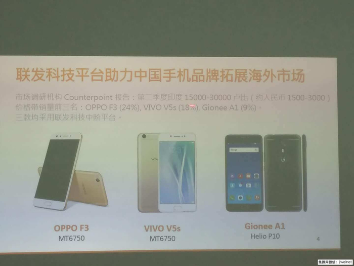 据市场调研机构Counterpoint报告显示,今年第二季度印度15000-30000卢比(约人民币1500-3000元)中高价格销量前三名分别是OPPO F3占比24%,VIVO V5s占比18%,金立A1占比9%,其中OV和金立分别采用了联发科中阶平台MT6750和P10。